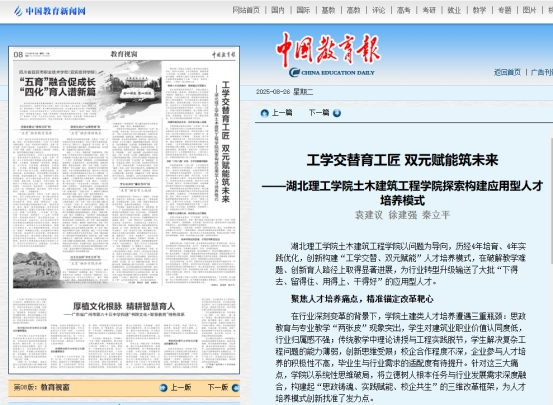 本网消息 近日,《中国教育报》在“教育视窗”专版,刊发文章《工学交替育工匠双元赋能筑未来》,报道我校土木建筑工程学院在破解教学难题、创新育人路径上取得的创新成果。
