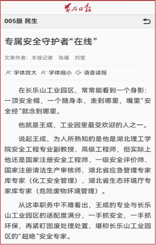近期,多家媒体报道致公党湖北理工学院支部副主委王成服务地方企业发展的事迹,黄石日报以“专属安全守护者‘在线’”为题、公众号首善下陆以“找到了!工业园背后的‘安全守护者’”为题,推介了王成服务长乐山工业园区的事迹。