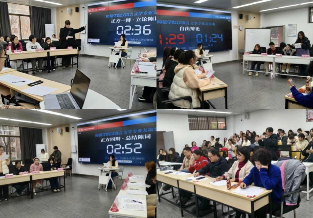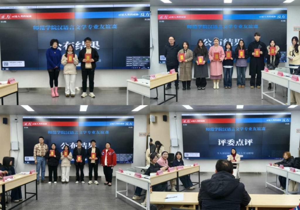 本网消息 12月19日,师范学院汉语言文学专业在J2-308教室举办“AI是人类的福祉还是威胁”主题辩论赛。来自汉语言文学专业四支队伍,两两对决,呈现了一场精彩的思想盛宴。