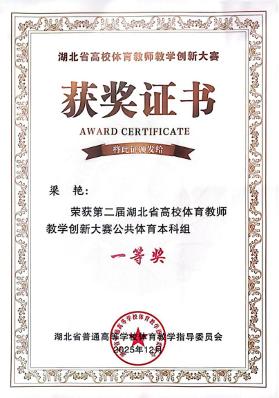 本网消息 12月26日,历时近两个月的第二届湖北省高校体育教师教学创新大赛在武汉大学圆满落幕。我校体育部梁艳老师凭借卓越的教学创新设计与扎实的专业功底,从全省众多参赛选手中脱颖而出,荣获公共体育本科组一等奖,阮璨老师斩获优秀奖。这是我校在该项省级权威赛事中的历史性突破,不仅充分彰显了我校体育教师的教学水平与创新活力,更是学校体育教育教学改革成果的集中亮相,有效提升了我校在湖北省高校体育领域的影响力与知名度。
