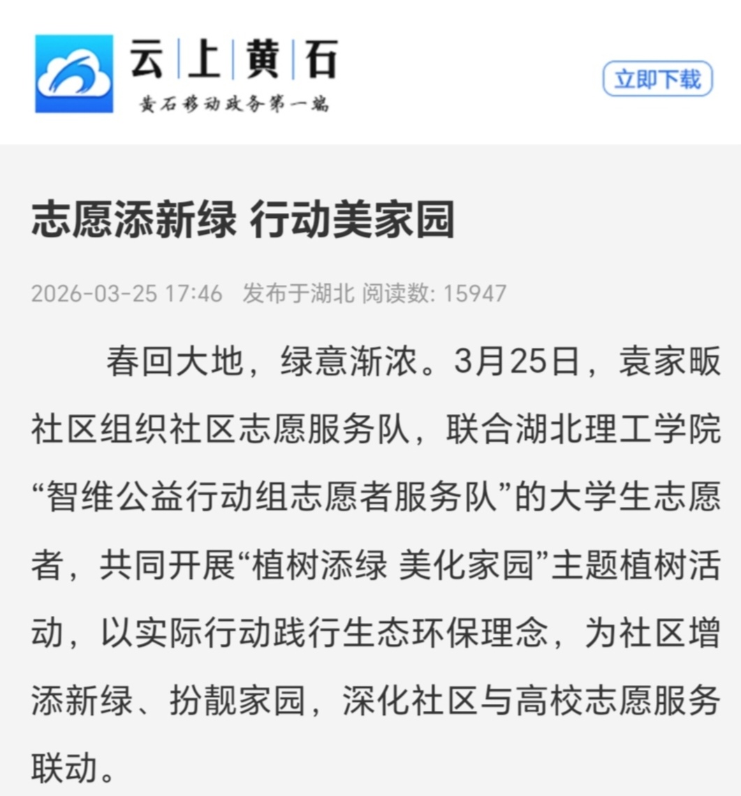 本网消息 3月25日, 云上黄石以“志愿添新绿,行动美家园”为题,报道了继续教育学院志愿服务队深入社区开展义务植树活动的生动实践。