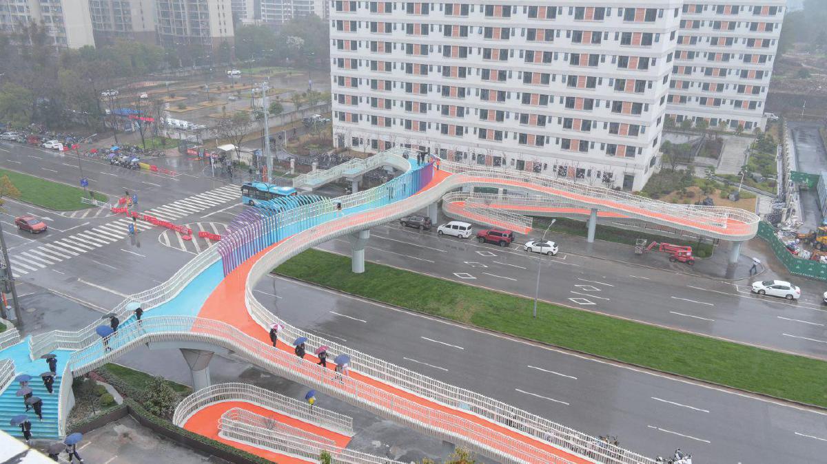 人行天桥的建成投用让湖北理工学院的学子们感受到了实实在在的方便,天桥用优雅的弧度,将速度与安宁、车行与人行、城市功能与校园生活,编织进同一幅城市图景。湖北理工学院学生夏思远说,以前从宿舍到校内上课,必须要等待漫长的红绿灯穿过磁湖路,需要大家在车流间隙中快步通过,现在天桥的落成通行,让他们的出行变得更加方便快捷了。